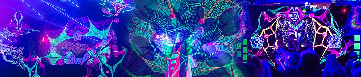 Voeman Decotiimi is a group of decorators founded in 2013 from the land of the “fish cock” aka. Kuopio. In the beginning decorations were made only of recycled materials, but with practice the materials and techniques have improved. The main goal is still to use recycled materias as much as possible. Now, the decorators are tinkering with paint crochet hooks and a jigsaw boosted with coffee and swearing. During the past several years Voeman Decotiimi has done installations around Finland in different venues from clubs to forest parties. They have also done one event at Canary Islands. The core team members are now Anni & Anna & Viivi with shifting assistants per each event they travel to. They are putting up psychedelic decorations seasoned with a cyberpunk look. Today you can catch us near Helsinki & Tampere.